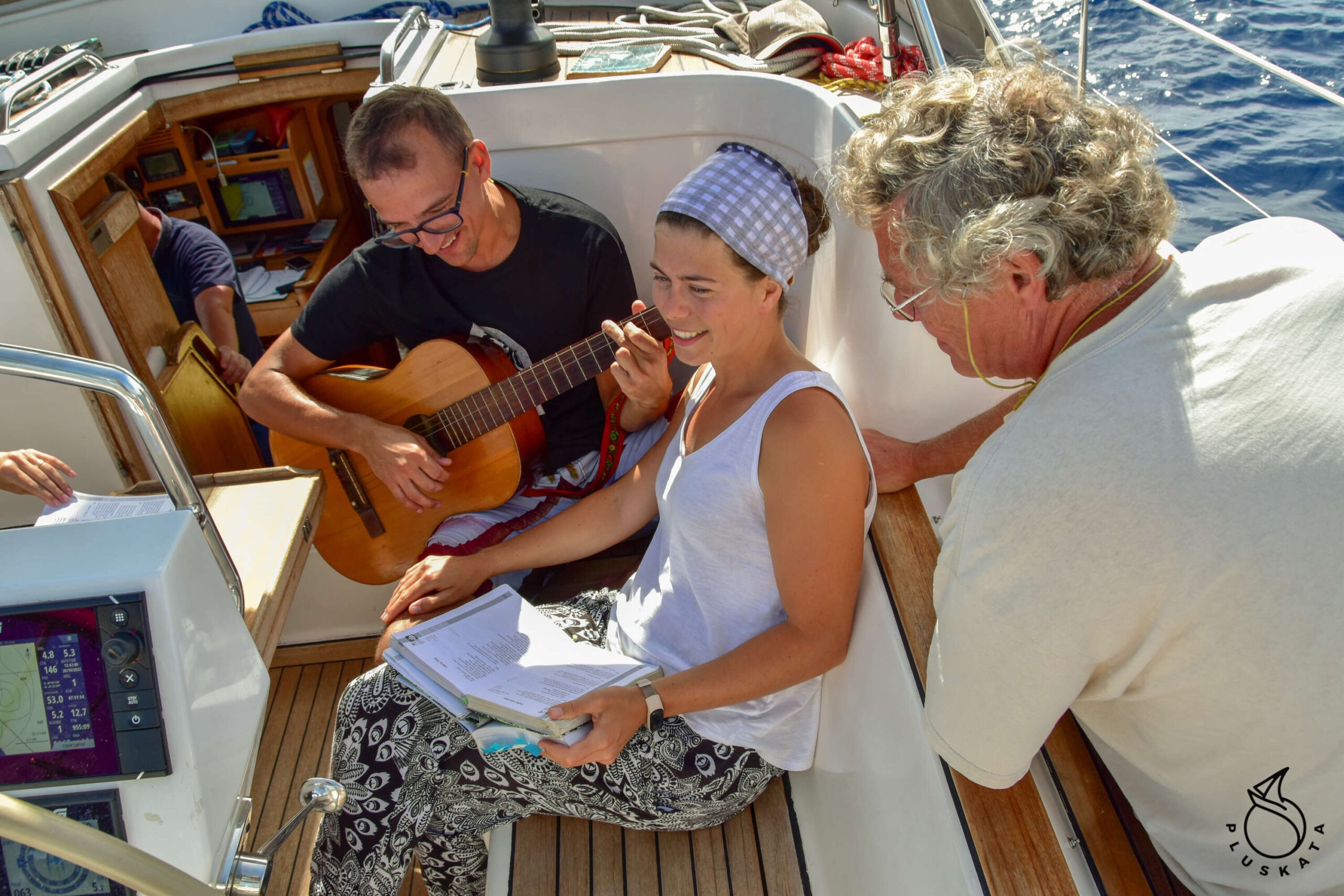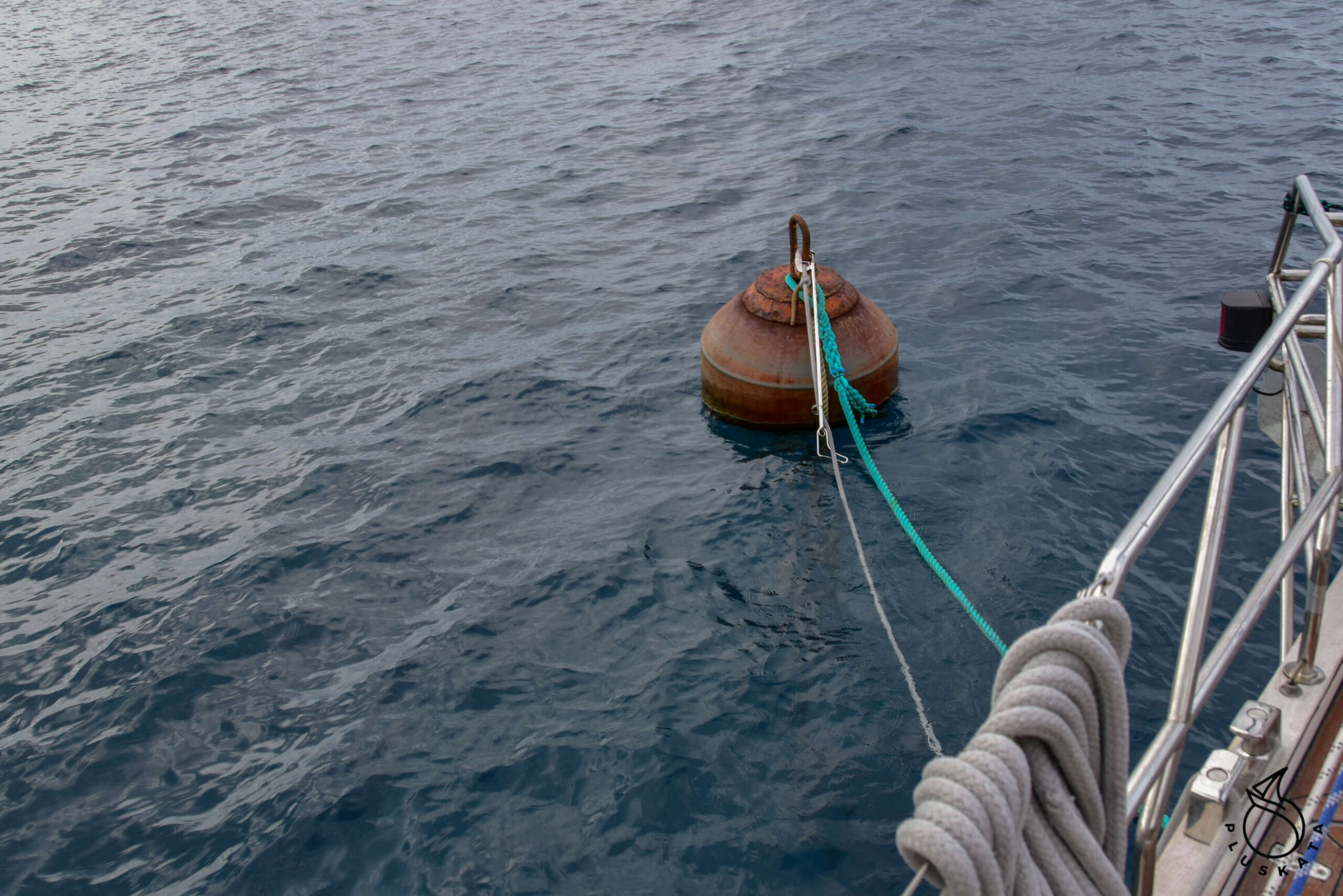 You can see beautiful stars at night. In the distance we see ships and yachts, but far away and not on a converging course. In the morning the moon rises, it is after the new moon (about 8%), but the obwarzanek has from the bottom – we are much more to the south than Poland. During the day, the wind weakens even more, so at 2 p.m. we turn on the engine. Large turtles pass us by, and a bird similar to a large swallow is circling the yacht.