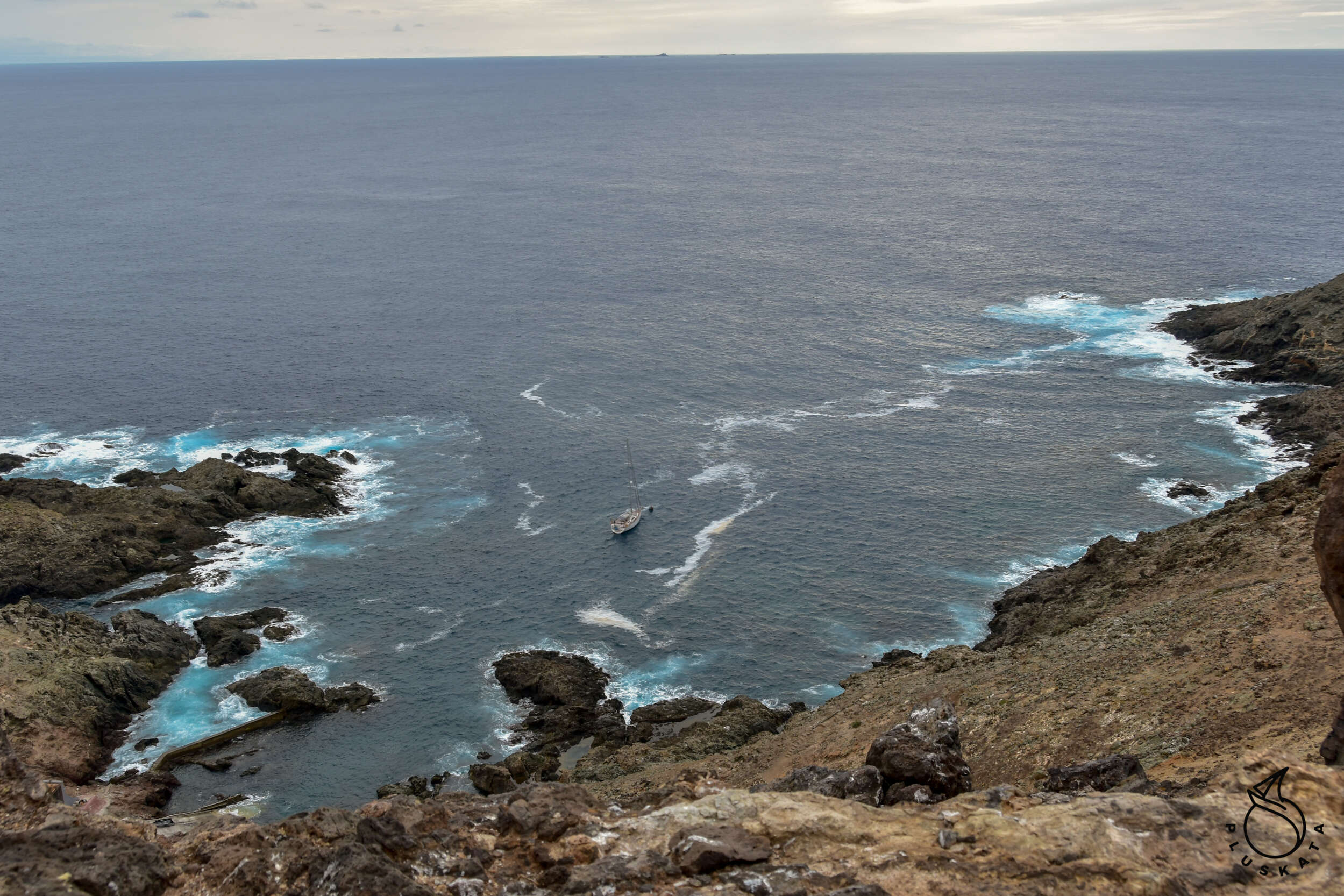 In the morning, after breakfast, we assemble the boat, take a bath and after 1pm we go on. The island staff says goodbye to us – they wave and turn on the sirens. We set the sails and in the wind of 7 kn we sail 4 kn. In front of the Salvagem Pequenio island, we are making a turn. For dinner, pasta with pesto and cheese, and after lunch, coffee with chocolate. Delicious. Around 4pm the wind reaches 3kn so we start the engine.