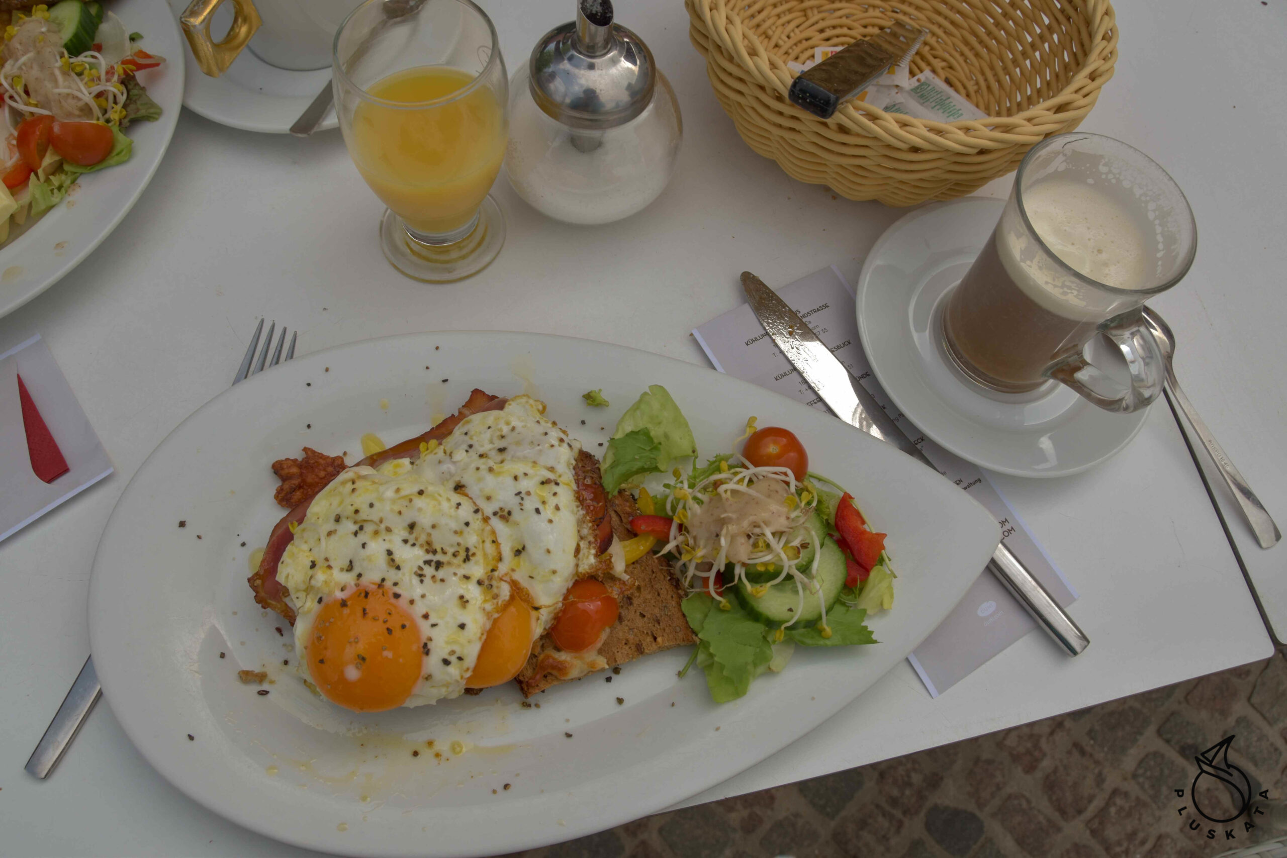 We get up before 8 am, fill up with water, and then go to the breakfast room nearby (near the lighthouse) for breakfast. We take an American breakfast, i.e. scrambled eggs with bacon, a muffin and pancakes with maple syrup, and a delux breakfast, i.e. 2 toasts with fried eggs with bacon, and a salad. Everyone takes coffee too.
