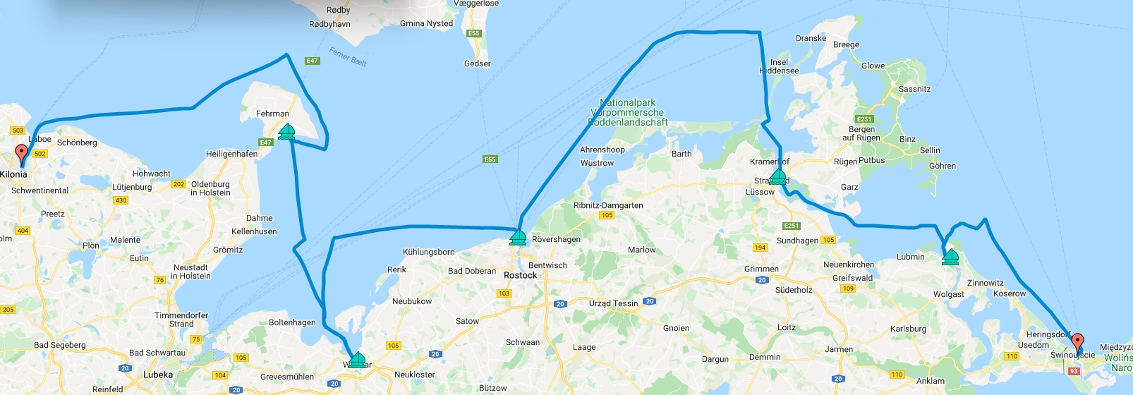 Route: Świnoujście – Penemünde – Stralsund – Warnemüde/Rostock – Wismar – Burgstaaken – Kilonia