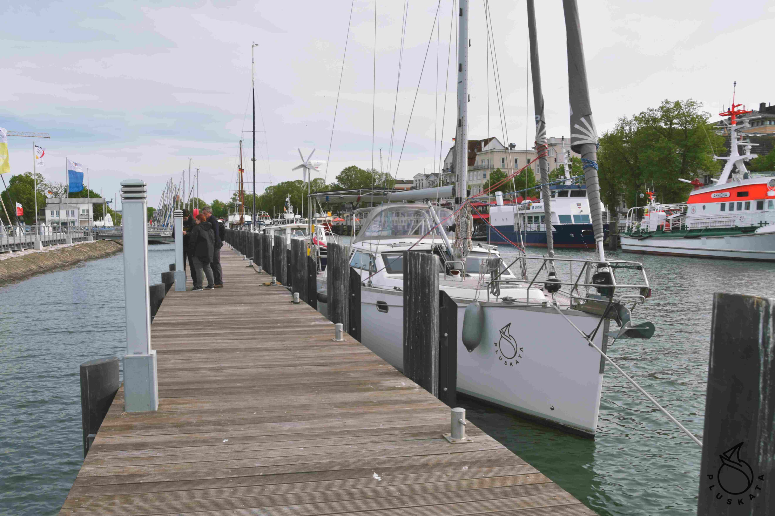 We go on the engine – it is shallow on both sides. At 2 p.m. we enter the Regattaverein marina in Penemünde. You enter the marina between two dolphins. Marina is tiny. Yachts stand bow to quay and stern to dolphins. Dalby are narrow and we cannot fit between them. We stand longside at the outer quay.